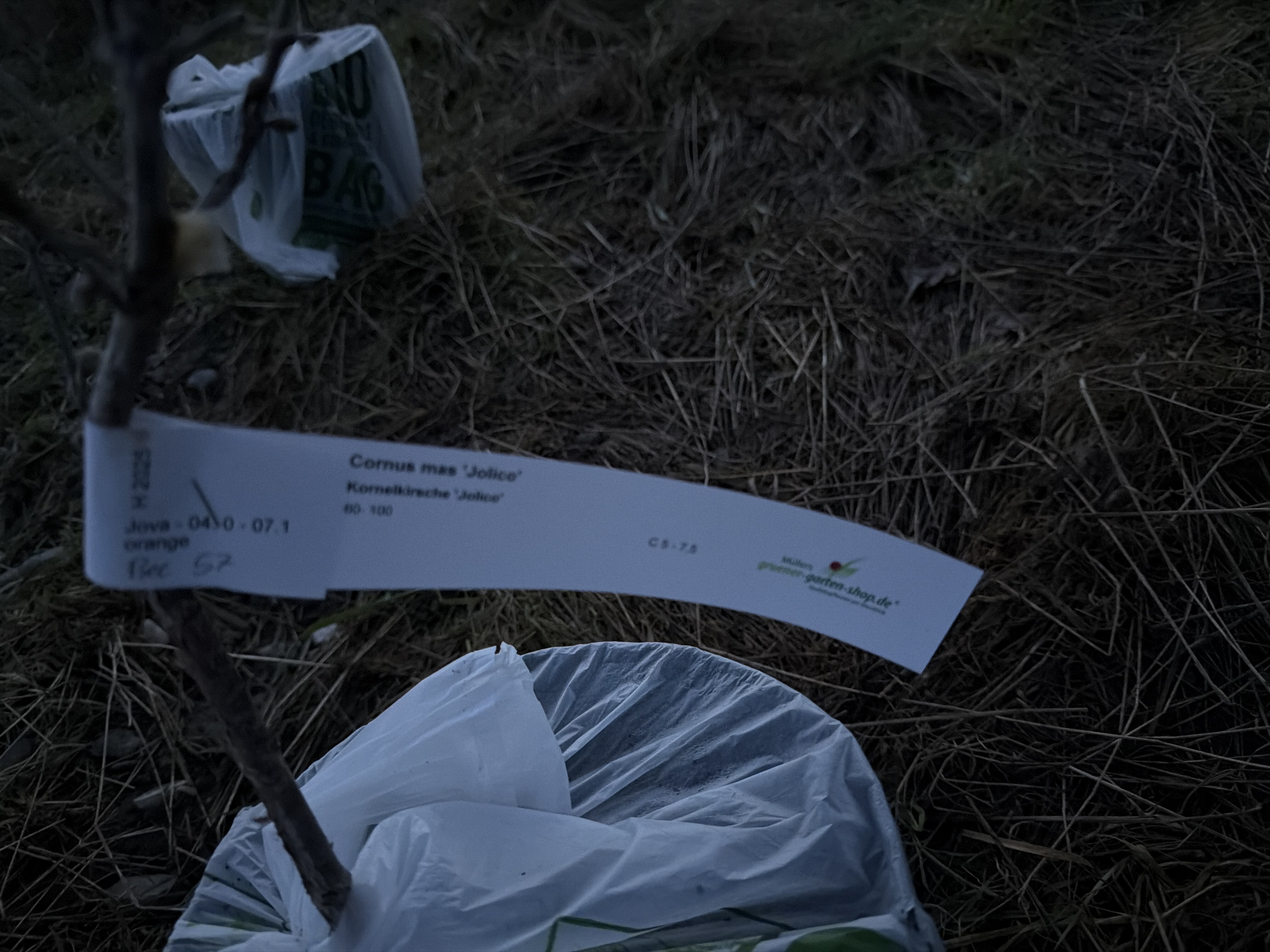 Am 2025-12-26 als Ballenware ohne Kies bei Bodenfrost gepflanzt. Direkt Gitter drum gemacht.