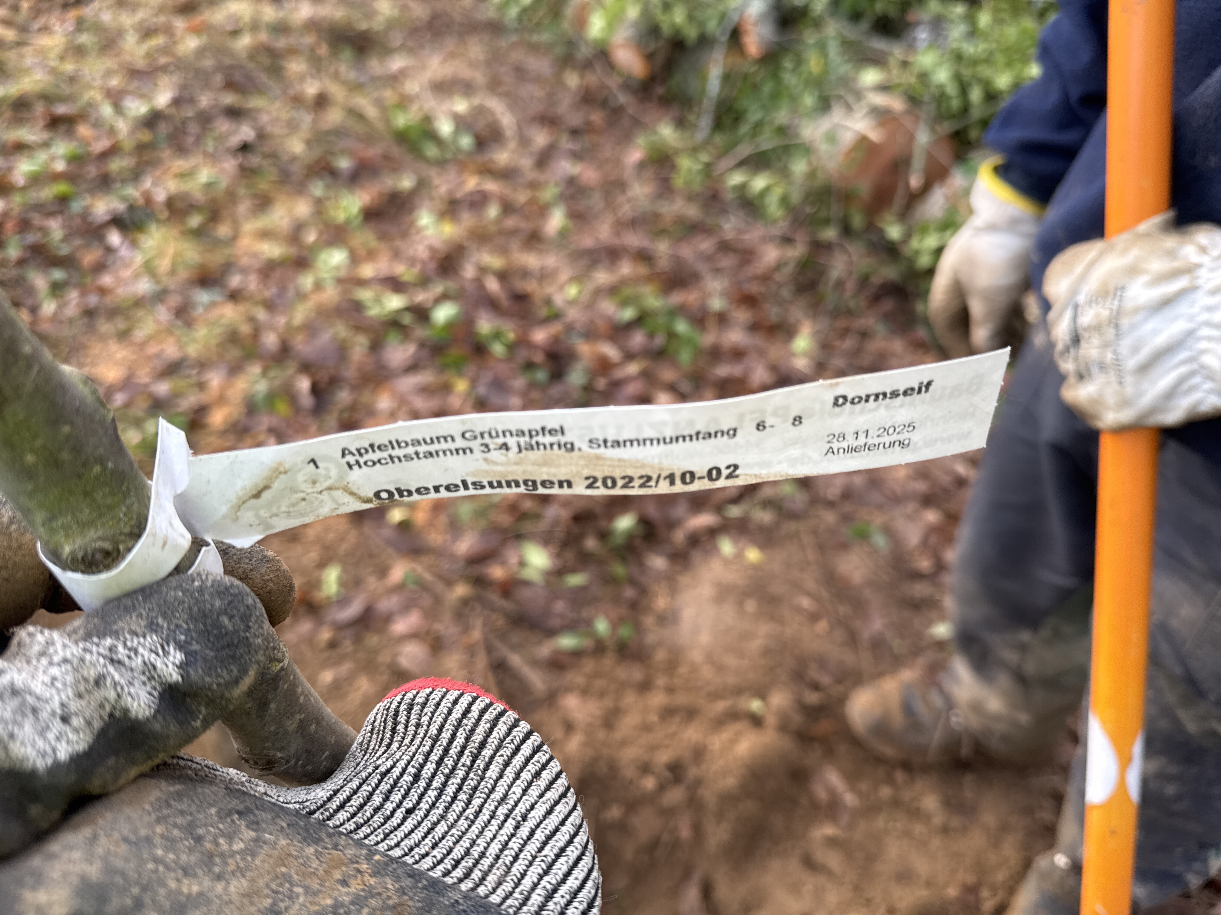 Am 2025-12-16 mit Wurzelschnitt und Kronenschnitt in Kies gepflanzt. Der Boden war fein krümelig, humos, aber sehr fest. Viele dicke Wurzeln von den Bäumen am Bach.