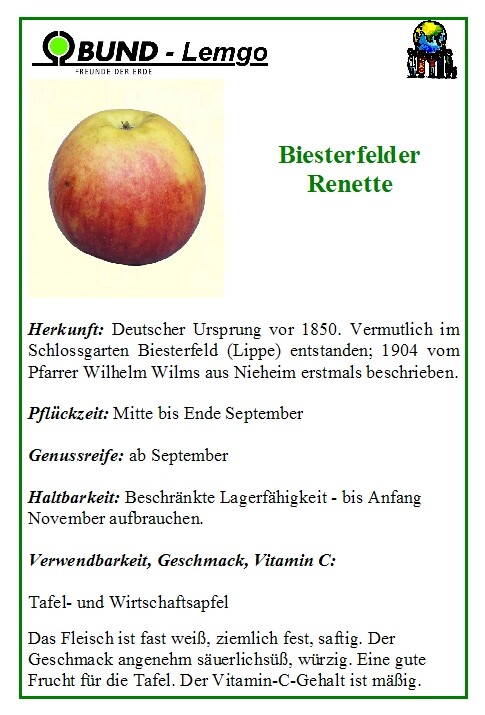 Dies ist eine Obstsorte des Genus Apfel. Sie wird bei Wikidata als [Biesterfelder Renette (Q858175)](https://www.wikidata.org/wiki/Q858175) geführt. Die Wüchsigkeit ist sehr stark. Verwendung als Wirtschaftsobst. Weitere Informationen unter [bergischer-streuobstwiesenverein.de](https://bergischer-streuobstwiesenverein.de/biesterfelder-renette/) und [www.obstsortendatenbank.de](http://www.obstsortendatenbank.de/index.php?id1=gal_view&id2=sorten&img=&osi=0&osw=x&page=articles/list_view.php&sel=2&show_ctr=0&show_id=1&show_nam=1&show_num=1&show_syn=1&tn=0&typ=x).